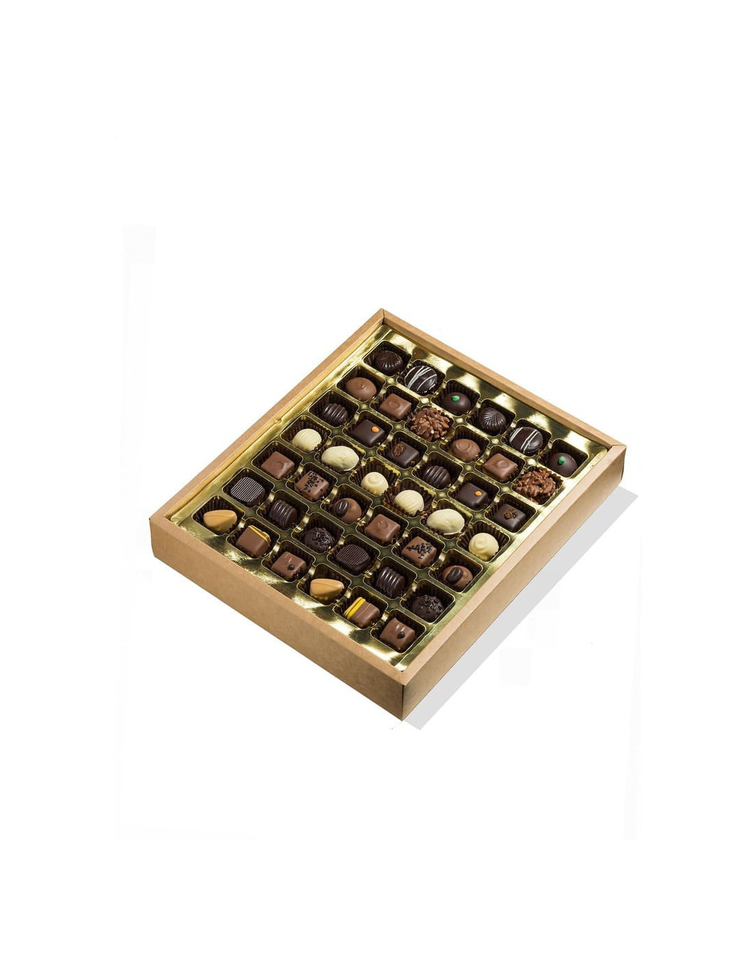 La caja de 84 bombones surtidos de chocolate artesano. Esta variedad de bombones elaborados a mano es el regalo perfecto para celebraciones, eventos de empresa o reuniones familiares. Incluye piezas con fruta de temporada, que aportan un contraste delicioso con el chocolate. La selección varía según la época y el stock, por lo que la imagen es orientativa y el contenido puede cambiar.