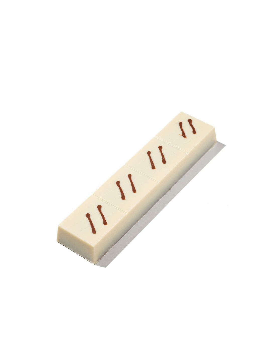 Turrón de ganache de chocolate con leche con trozos de galleta de mantequilla, bañado en chocolate blanco.