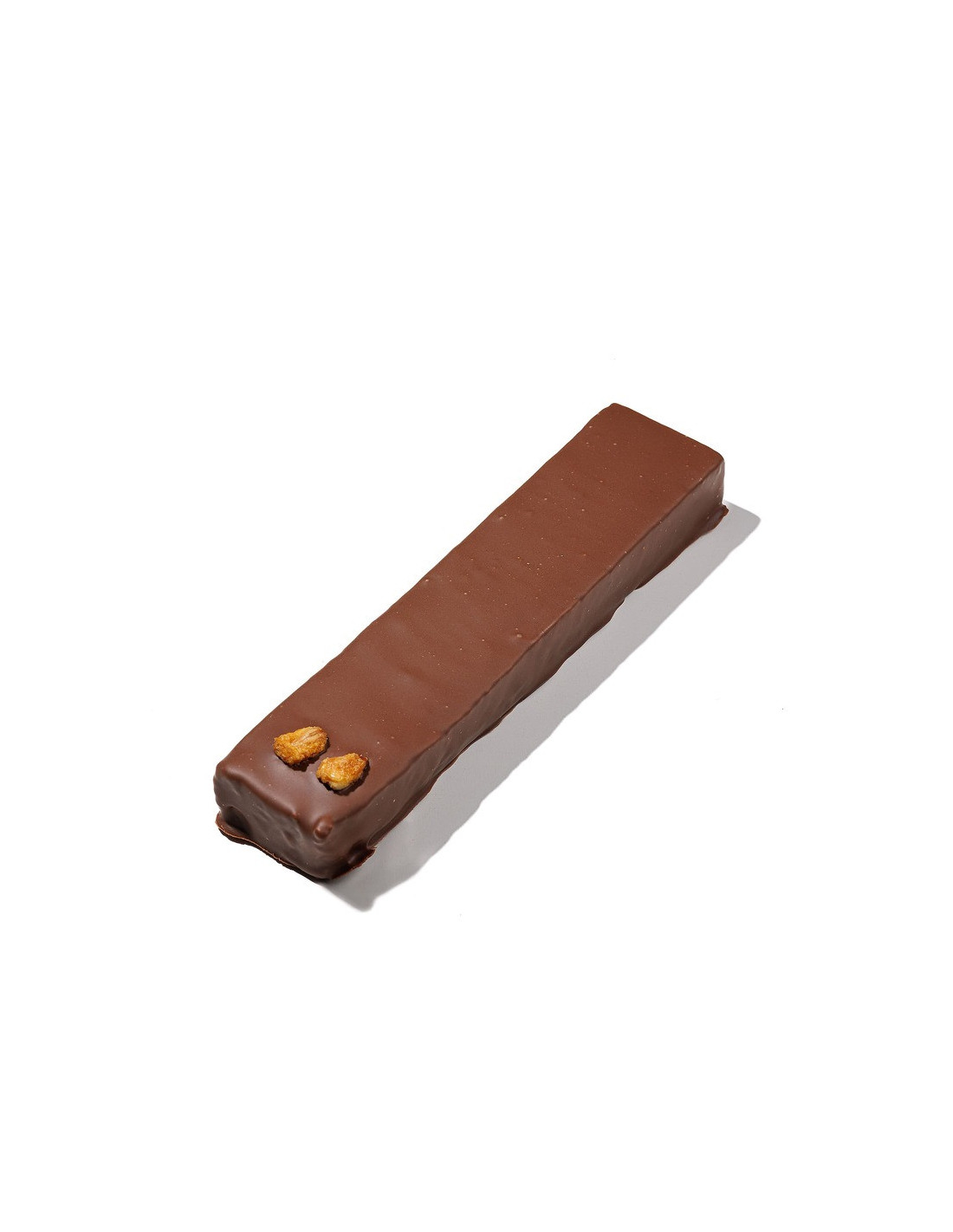 Turrón de praliné a la sal con crujiente de maíz tostado bañado en chocolate con leche extrafino.